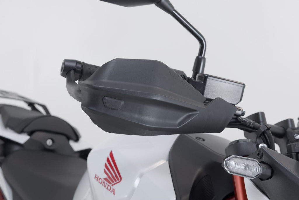 - Adventure handguards made of impact-resistant plastic protect against weather, falling rocks, and branches