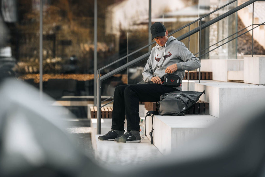 The bum bag is celebrating its comeback – now also with us! As a new edition in the completely waterproof version, this stylish bum bag is the right accessory for every motorcycle adventure and for all riders who like to have their items such as smart phones, wallets, and documents available in no time thanks to clever placement. These necessary essentials are stored safely in the elastic mesh pocket inside the bag.Attached to the waist with a click, the Belt WP can be worn flexibly in the middle, to the side, or facing backwards. You can also attach it to your own belt. Your personal valuables are well protected in the Belt WP – whatever the weather. The smart distribution of weight across the body ensures the best possible comfort and an aerodynamic riding experience – for motorcycle tours without compromises.