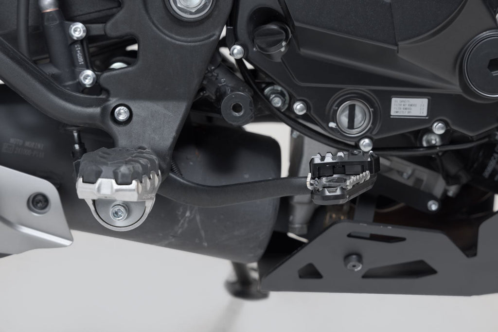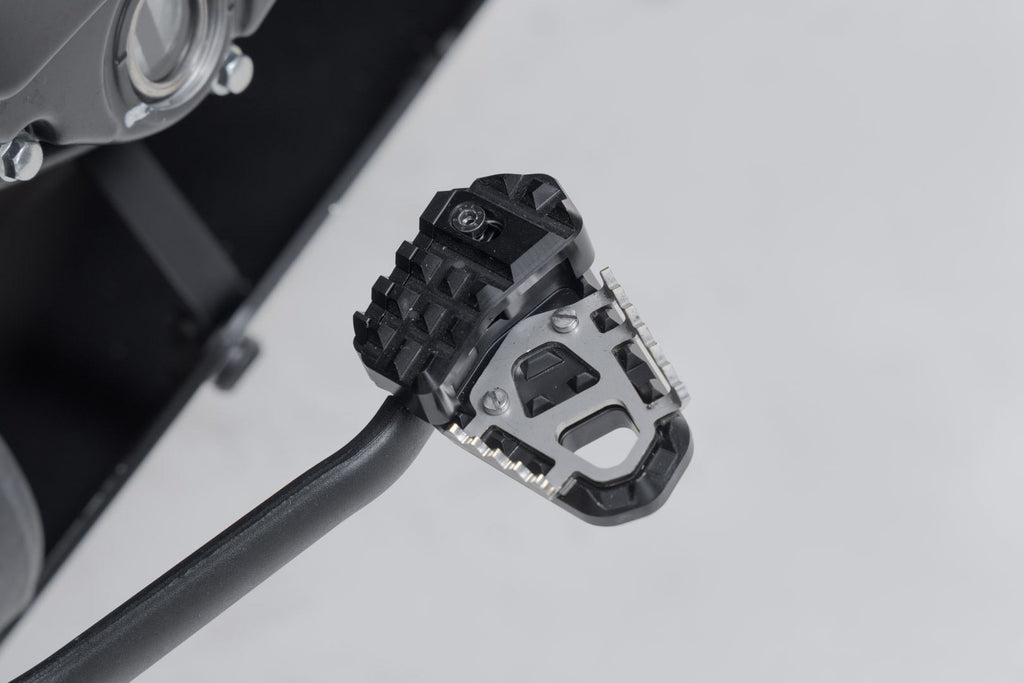 SW-MOTECH manufactures these extensions from high-strength milled aluminum alloy; they feature a black anodized surface and a stainless steel step plate. For optimal ergonomic adjustment, the increase in the brake pedal step can be adjusted in two stages of 22 or 27 millimeters.