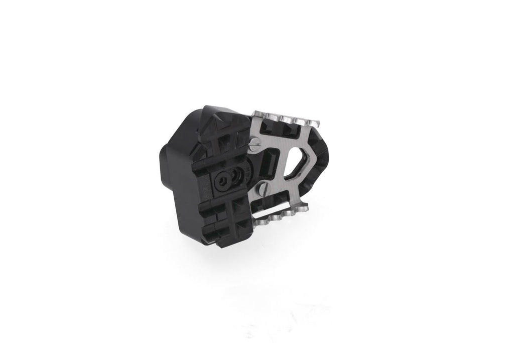 SW-MOTECH manufactures these extensions from high-strength milled aluminum alloy; they feature a black anodized surface and a stainless steel step plate. For optimal ergonomic adjustment, the increase in the brake pedal step can be adjusted in two stages of 22 or 27 millimeters.
