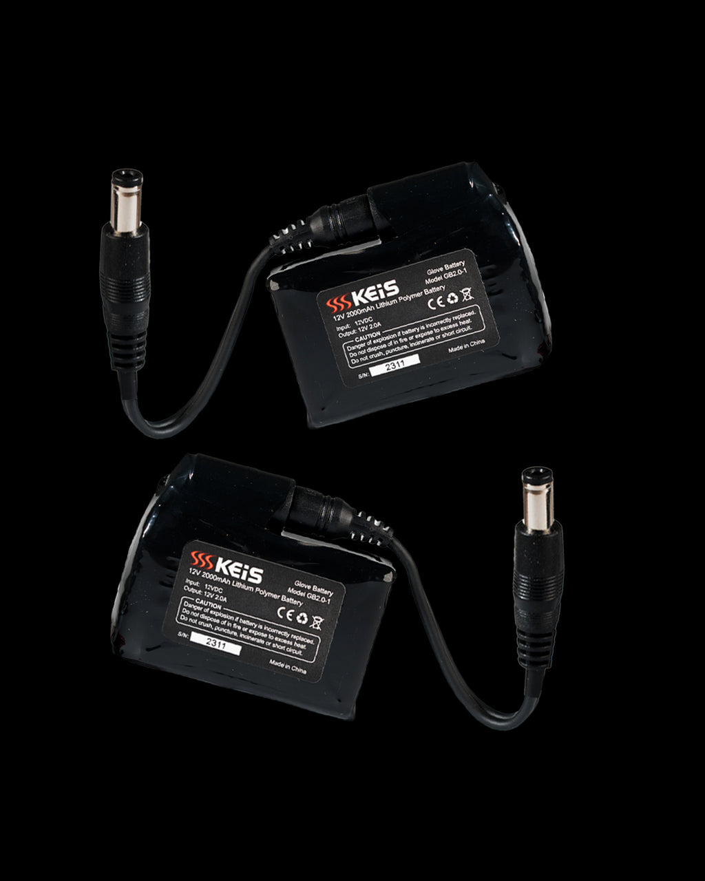 This set includes two 2000mAh (4000mAh total) rechargeable Keis Glove Batteries with a Multinational charger (for UK, EU and US plugs)
